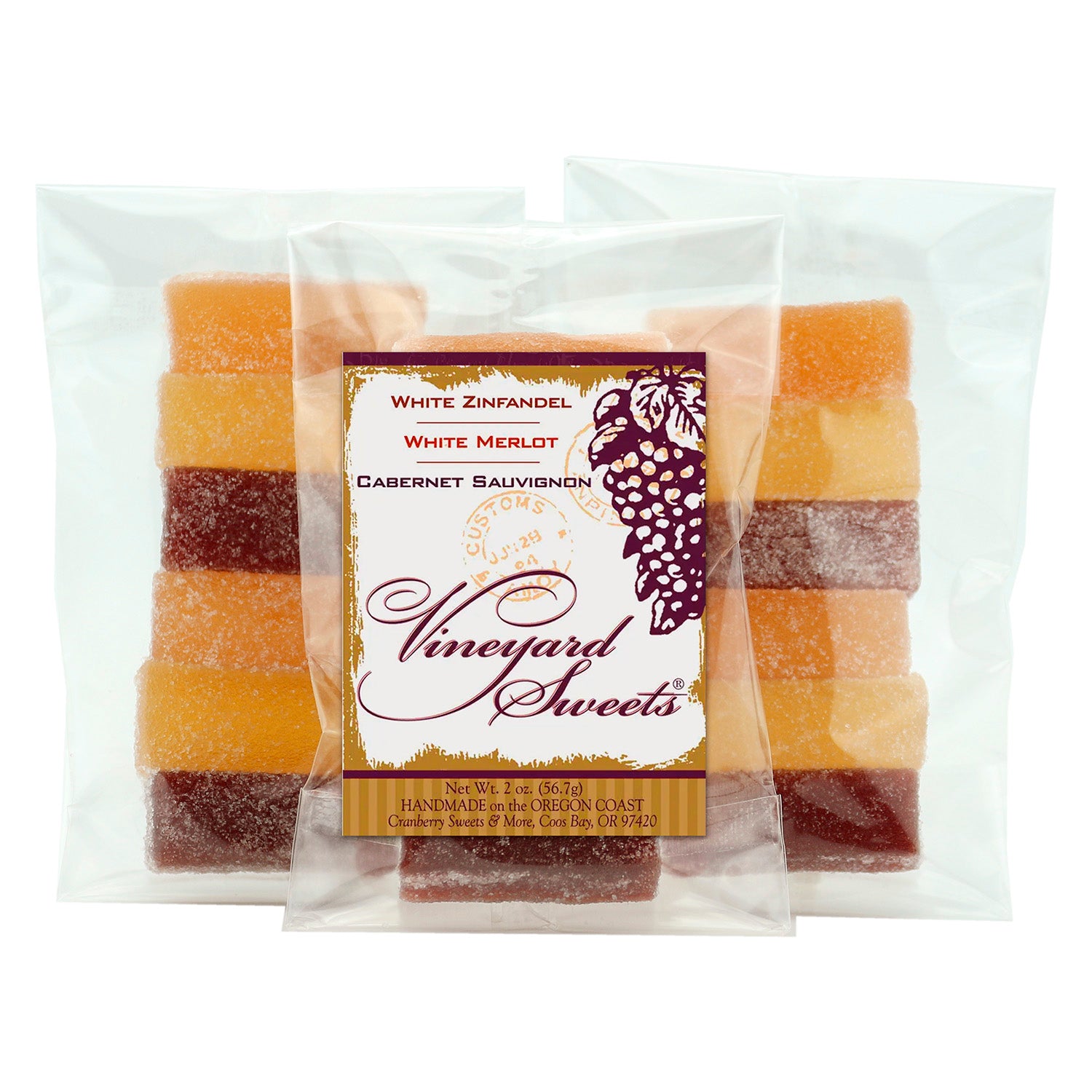 Experience a taste of our Vineyard Sweets® collection with this convenient bundle of three 2 oz. cello packs, each featuring six pieces of our wine-inspired pates de fruits. Savor the rich, real-wine flavors of Cabernet Sauvignon, White Merlot, and White Zinfandel—crafted with simple ingredients and nothing artificial.