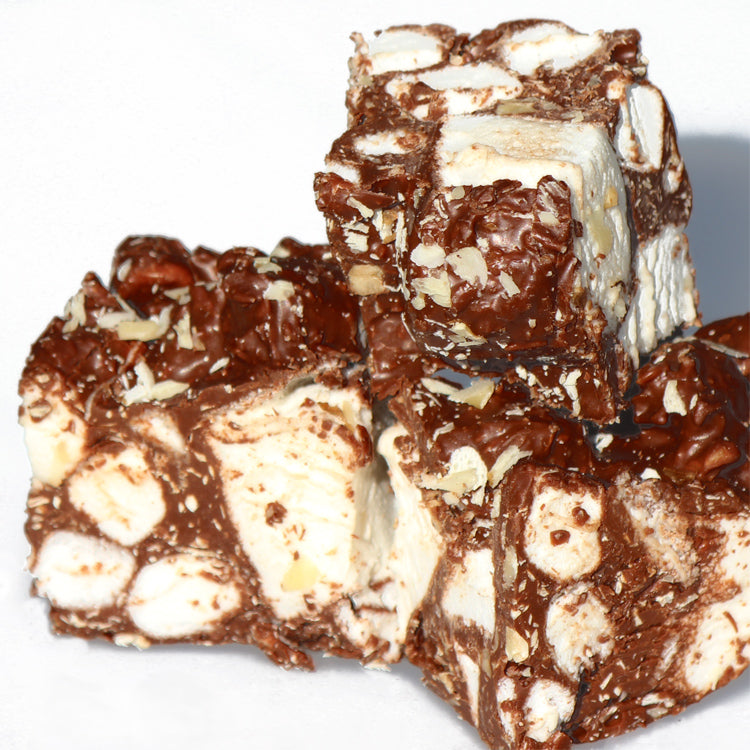 Ready to hit the sweet trail? Our Rocky Road is an all-American treat that’s sure to delight! Made with premium, melt-in-your-mouth milk chocolate, fluffy marshmallows, and crunchy walnuts, this sticky, gooey classic is a bumpy road you’ll want to travel again and again. Each generous slab is wrapped fresh in cellophane—perfect for sharing or savoring solo.
