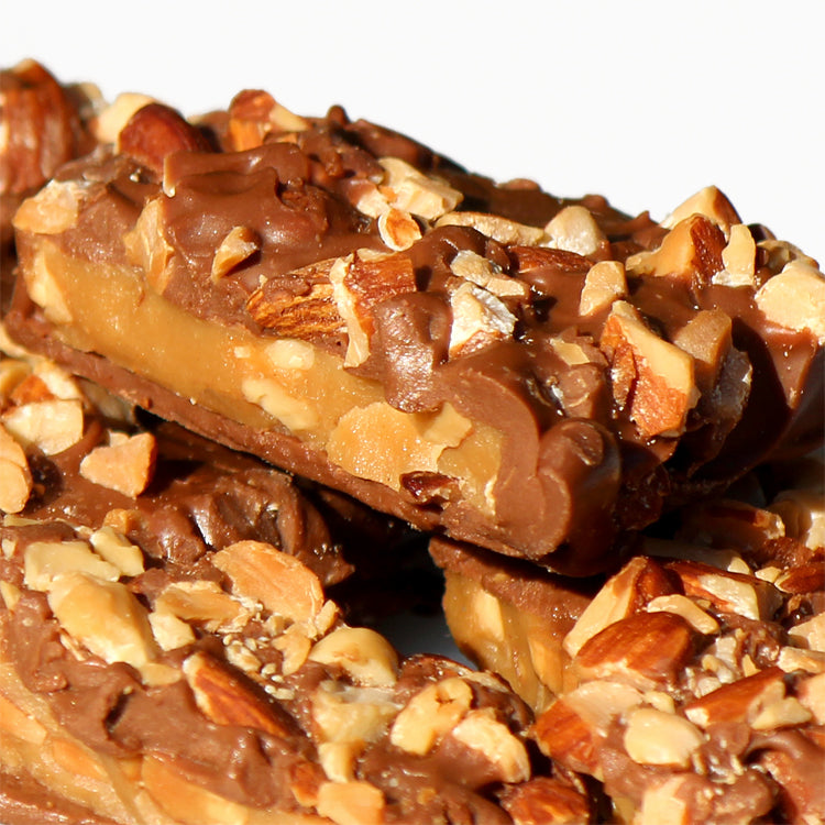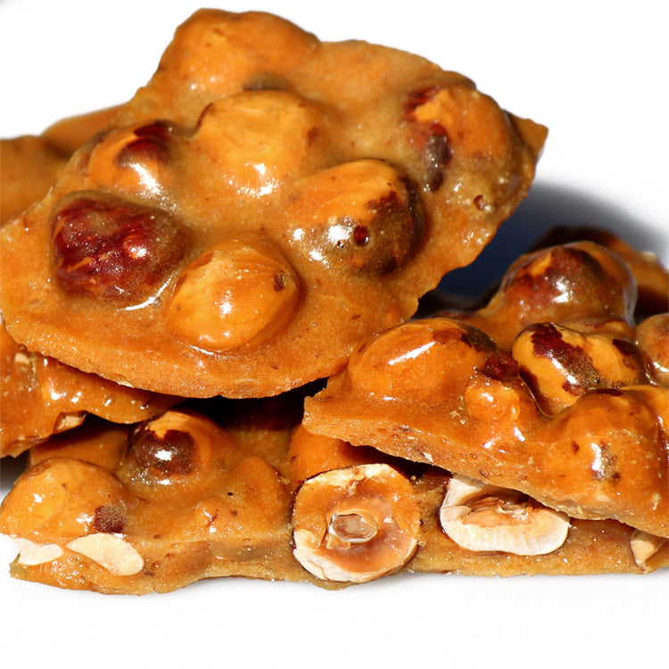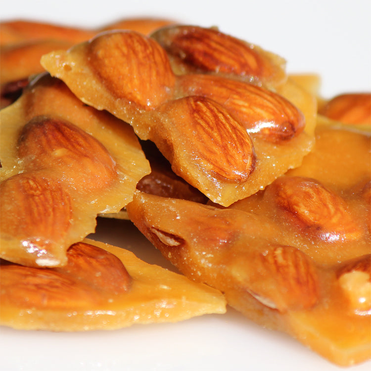 We cook our fresh nut brittles and almond toffee the old-fashioned way — in a large copper kettle with real ingredients: fresh butter, crunchy nuts, and Madagascar bourbon vanilla. Then we pour onto a marble slab, spread, cool, and seal for peak freshness and that clean, glassy snap.