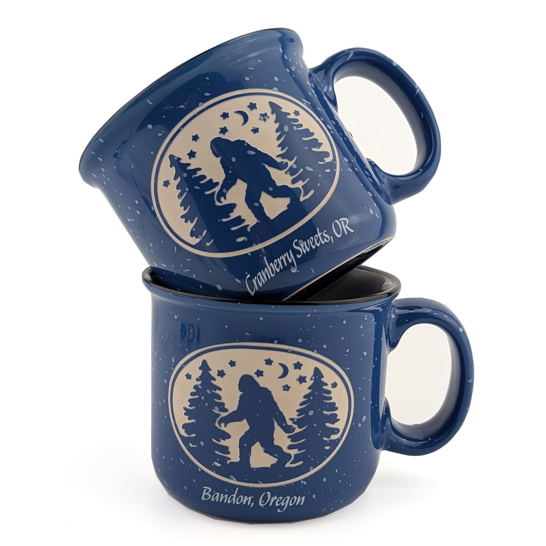 Our exclusive Bigfoot Camp Mugs are offered with two inscriptions - either "Bandon" or "Cranberry Sweets." Made of heavy duty etched ceramic, these generous 15 ounce mugs hold enough coffee, tea or cocoa to fuel any adventure that lies ahead. A great gift for believers young and old.